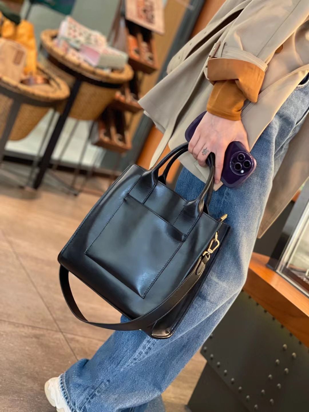 Сумка оснащена множеством функциональных отделений, включая отделение для мобильного телефона, аксессуаров, зарядного устройства и даже потайное отделение. Это позволяет удобно организовать пространство и всегда иметь под рукой необходимые вещи.