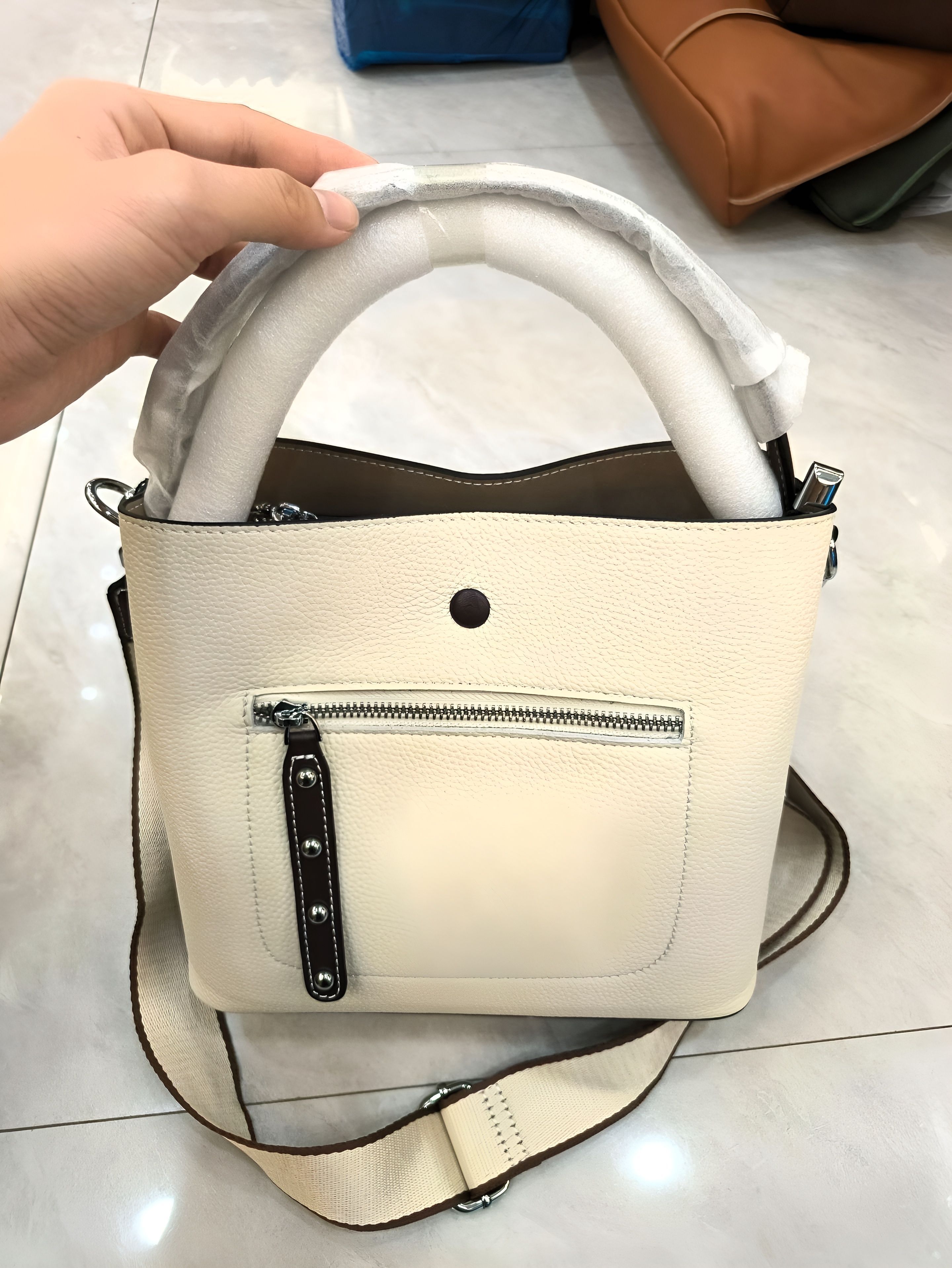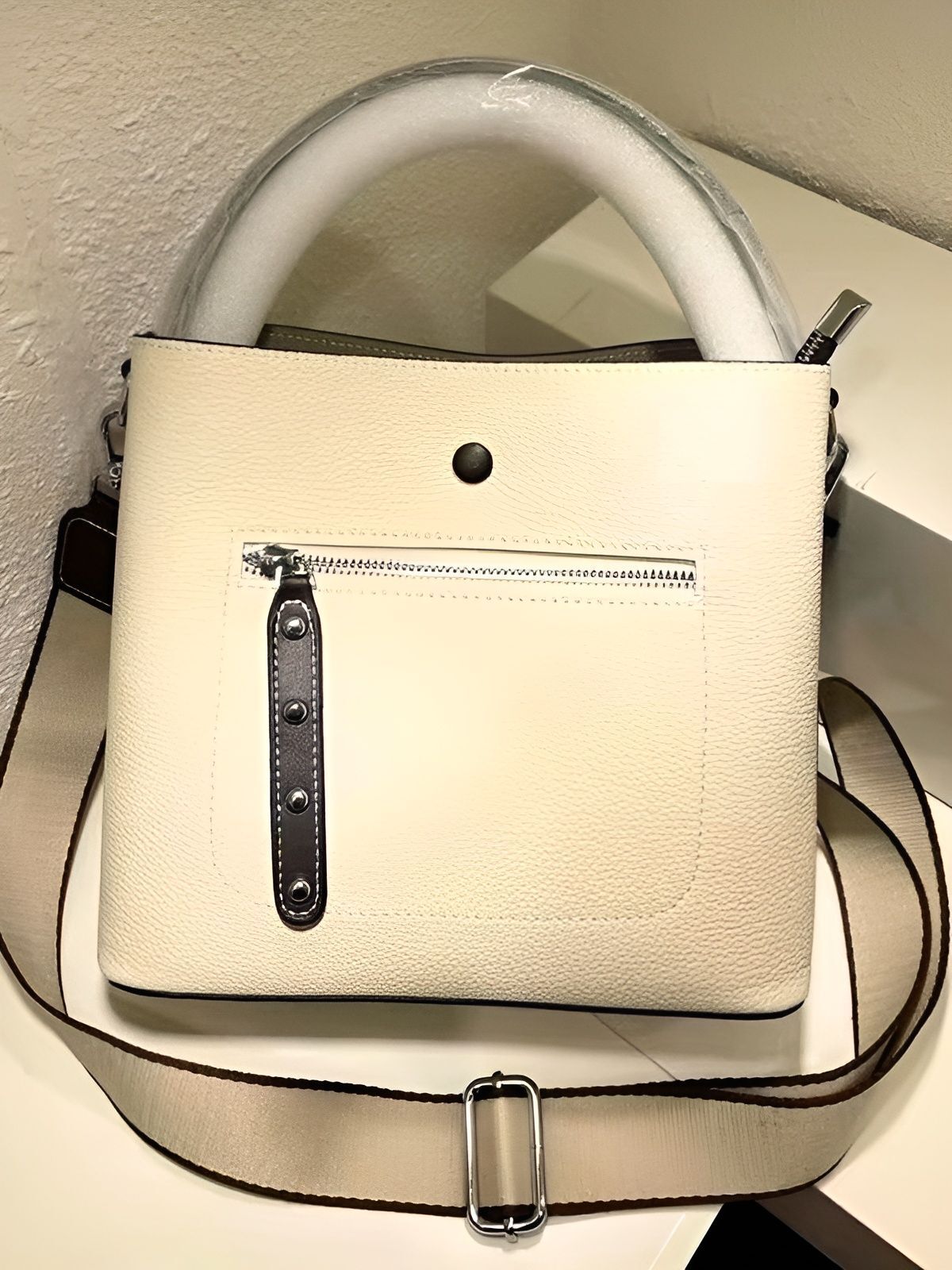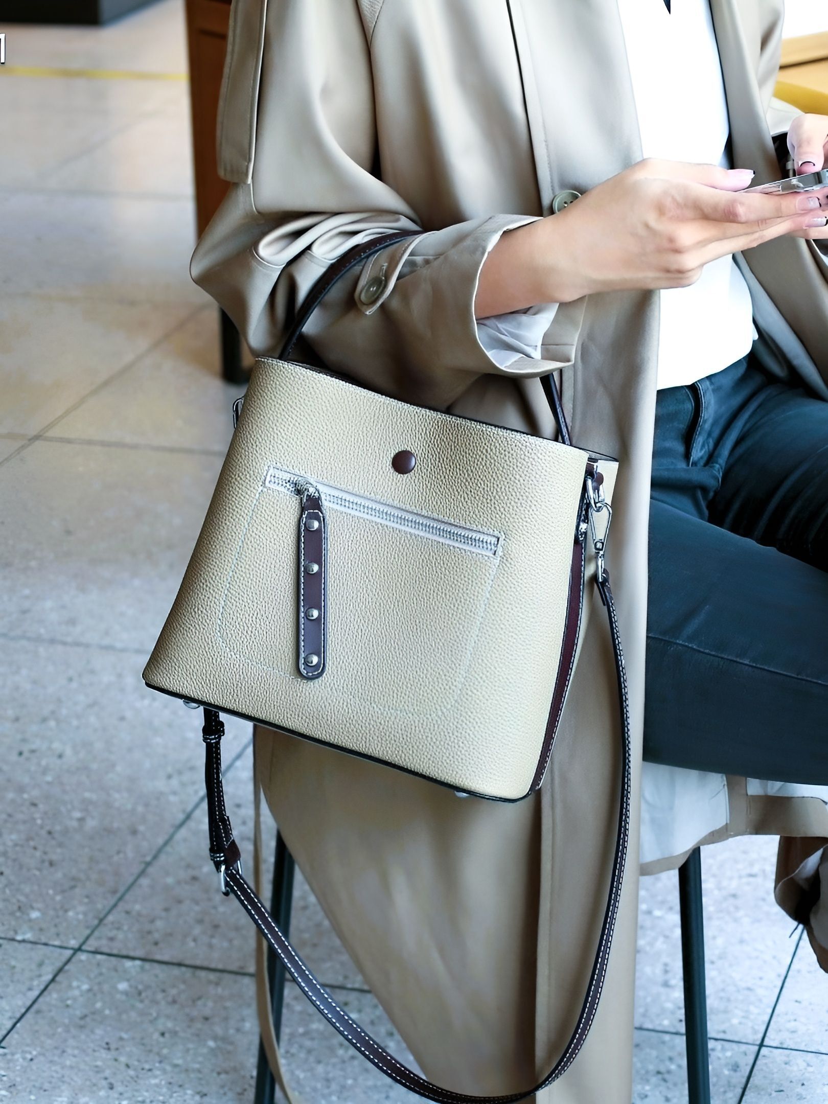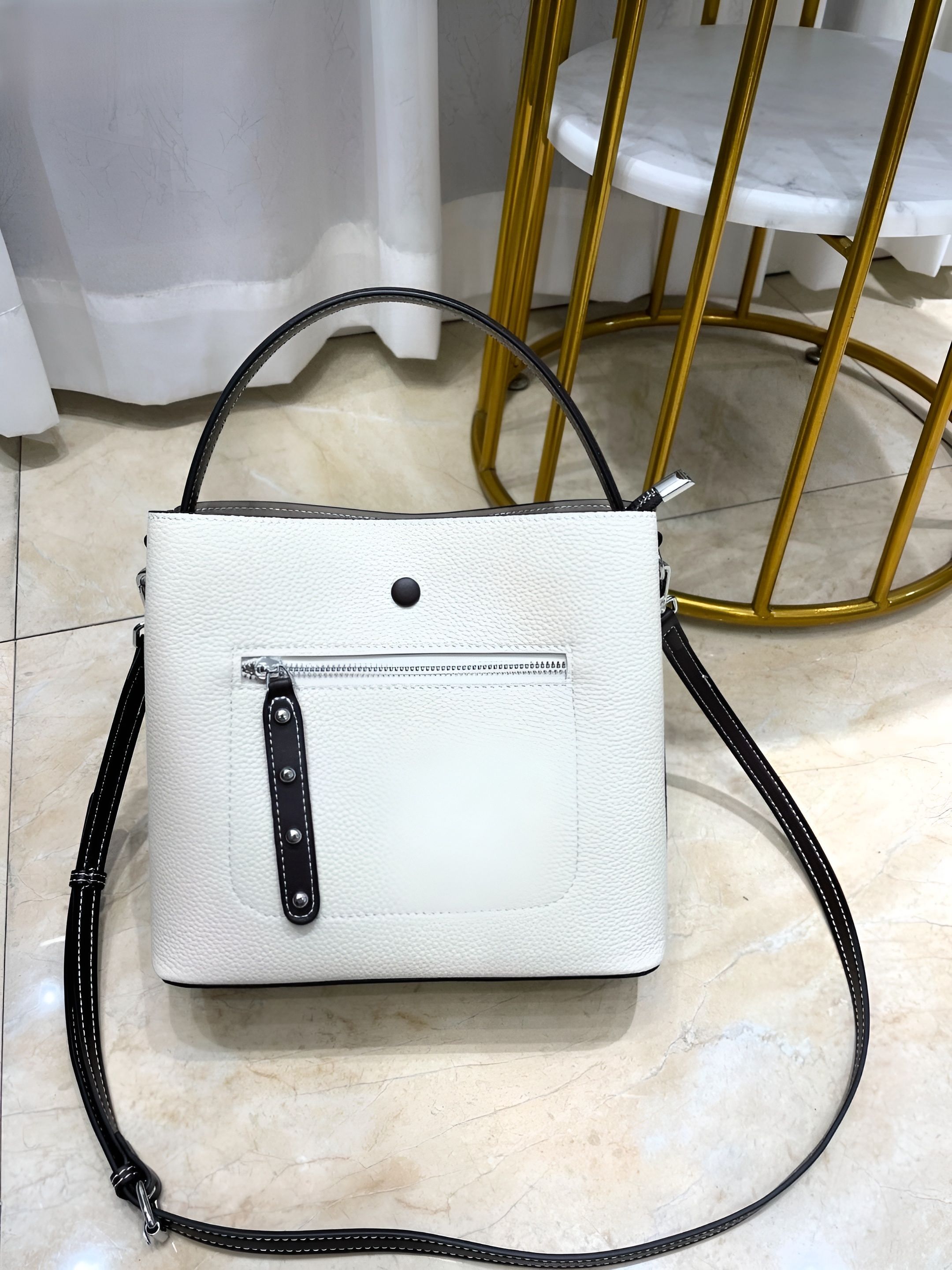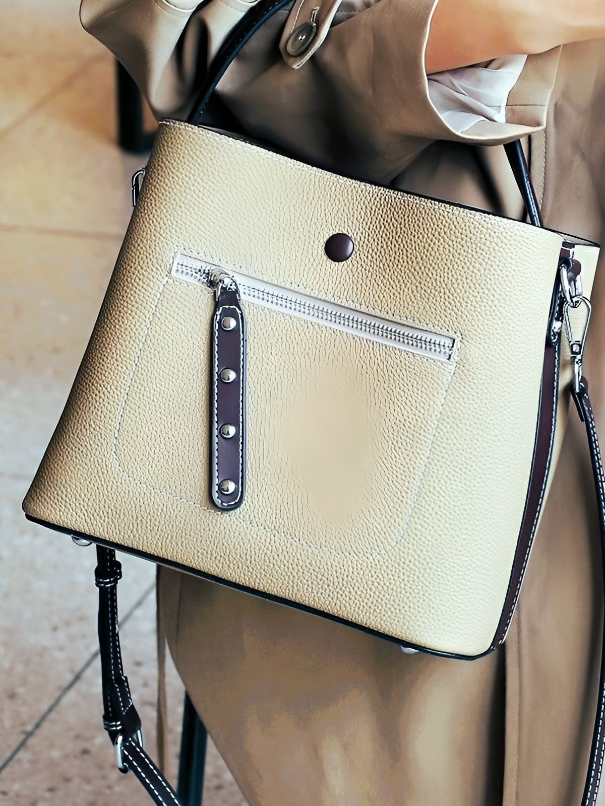 Легкий текстильный подклад и металлическая фурнитура дополняют комфорт эксплуатации. Цвет «слоновая кость» добавляет образу нежности и универсальности, сочетаясь с любыми стилями одежды.