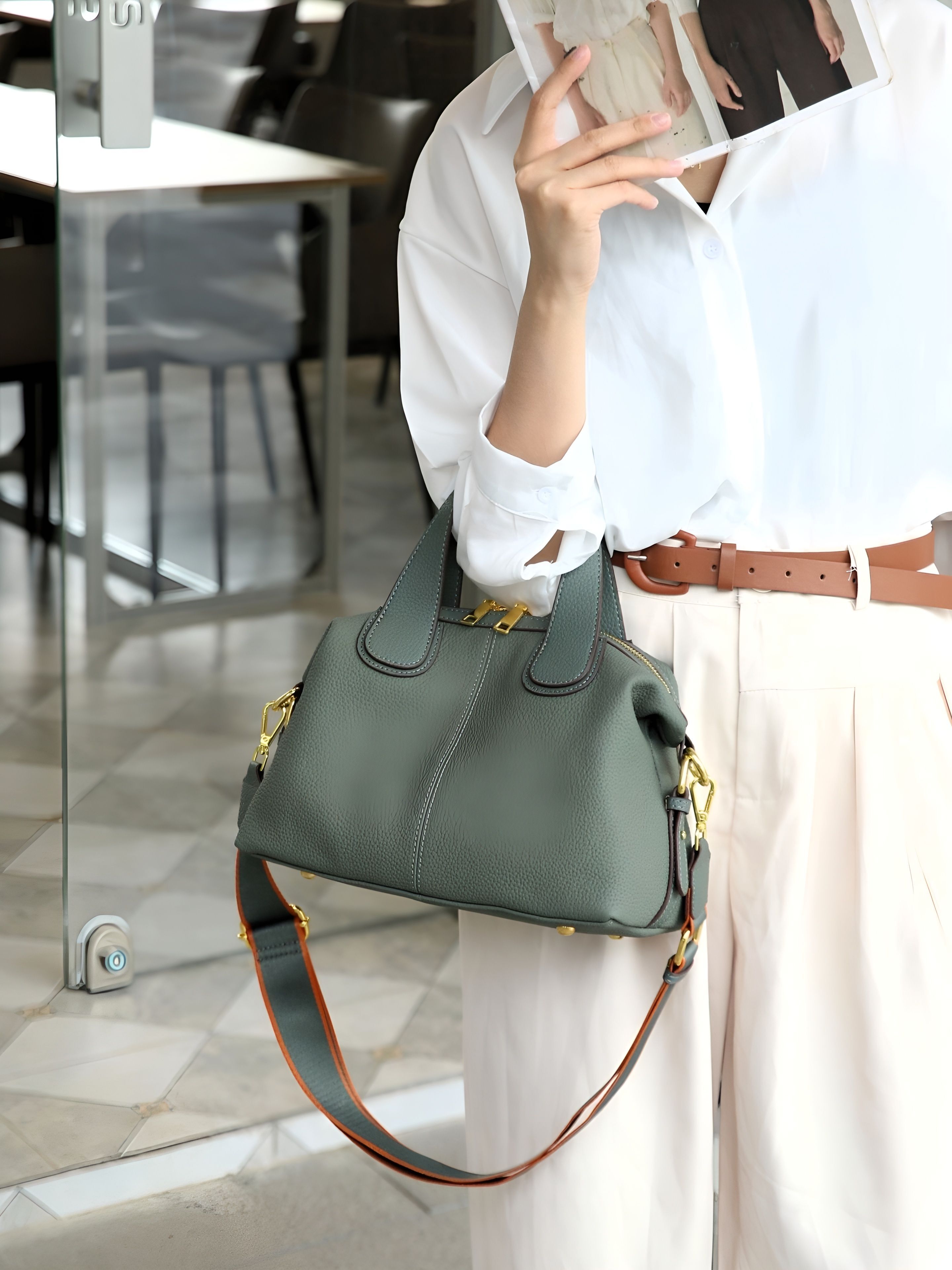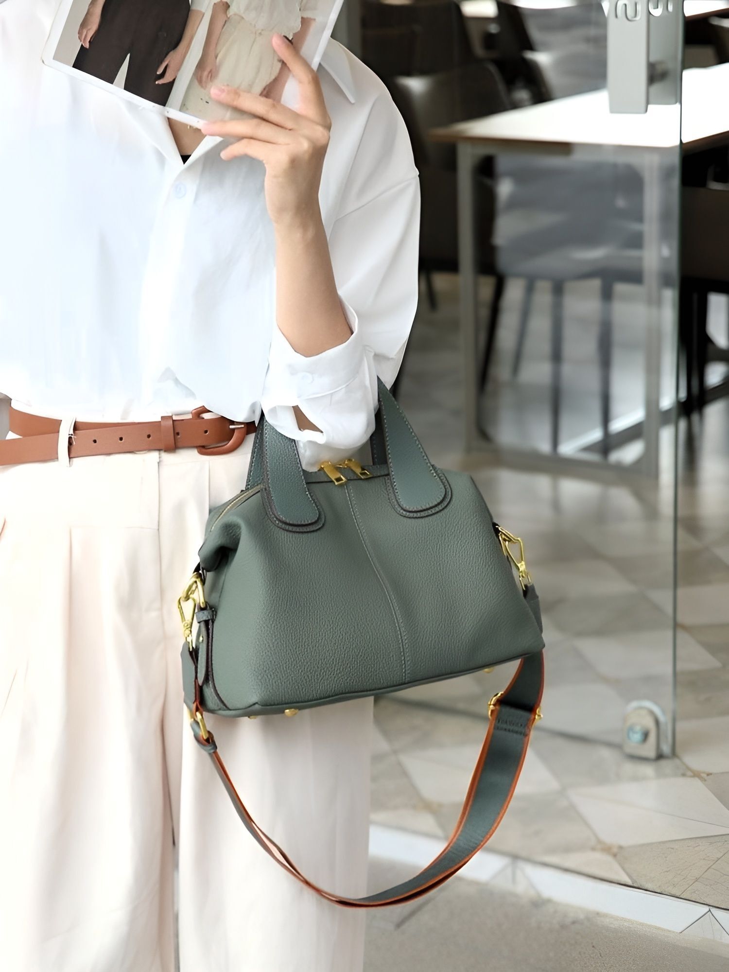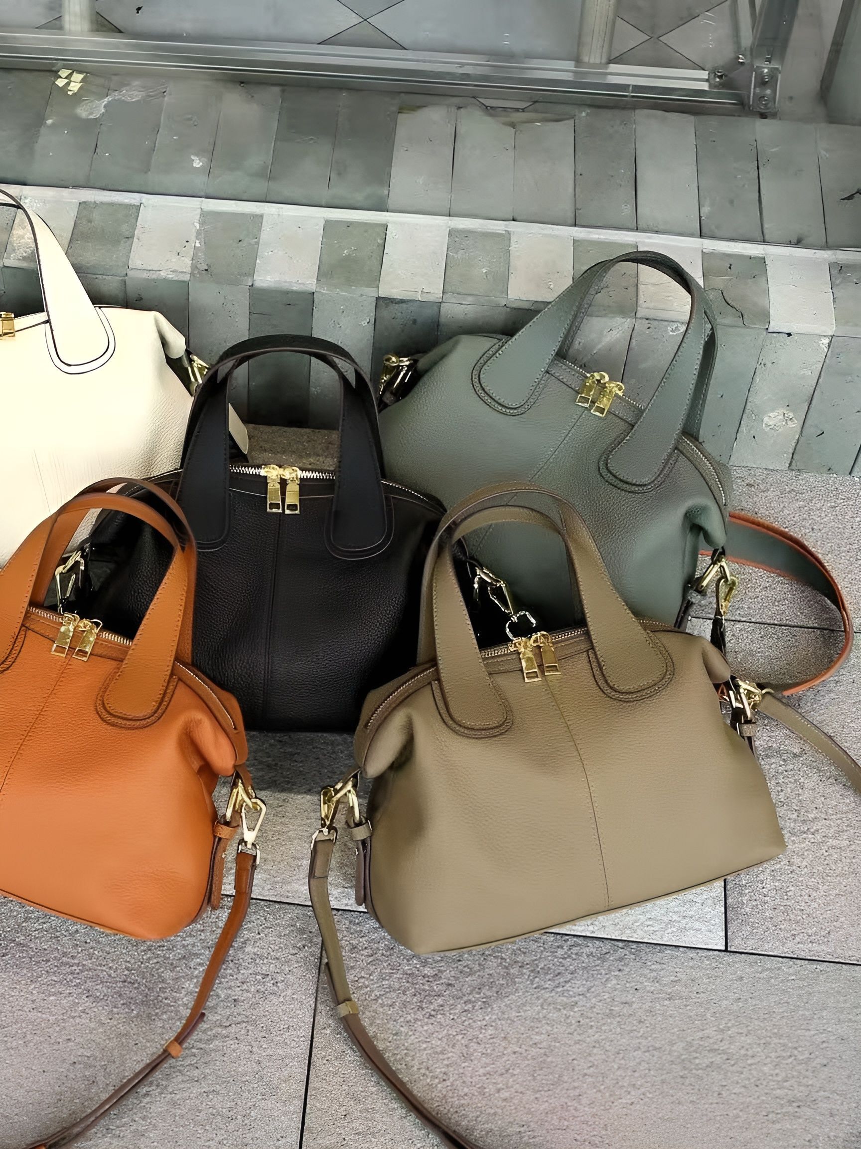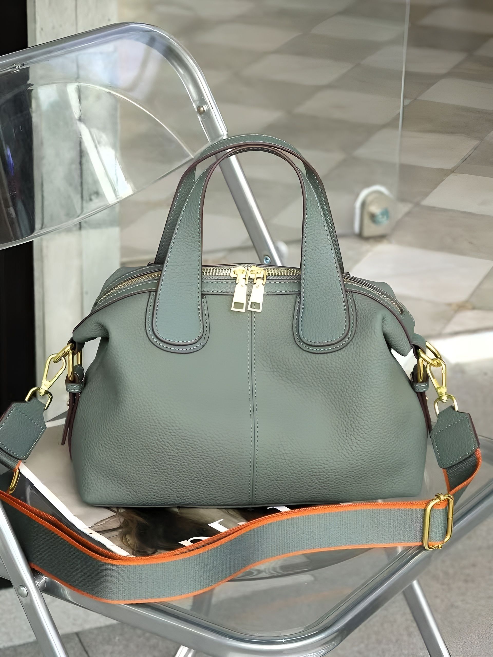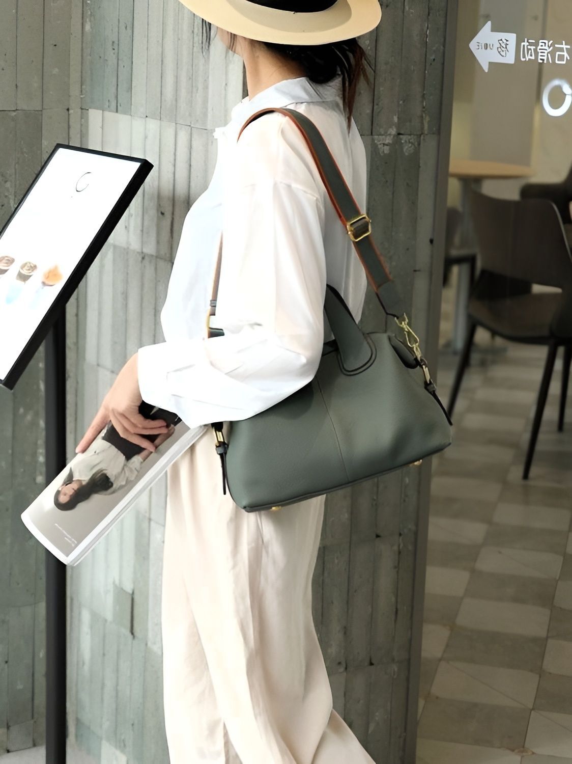 Элегантная повседневная модель выполнена из прочной натуральной кожи с водоотталкивающей пропиткой. Комфортный дизайн обеспечивает три способа носки: через плечо, на запястье или локоть благодаря двум тканевым и одному кожаному регулируемым ремню.