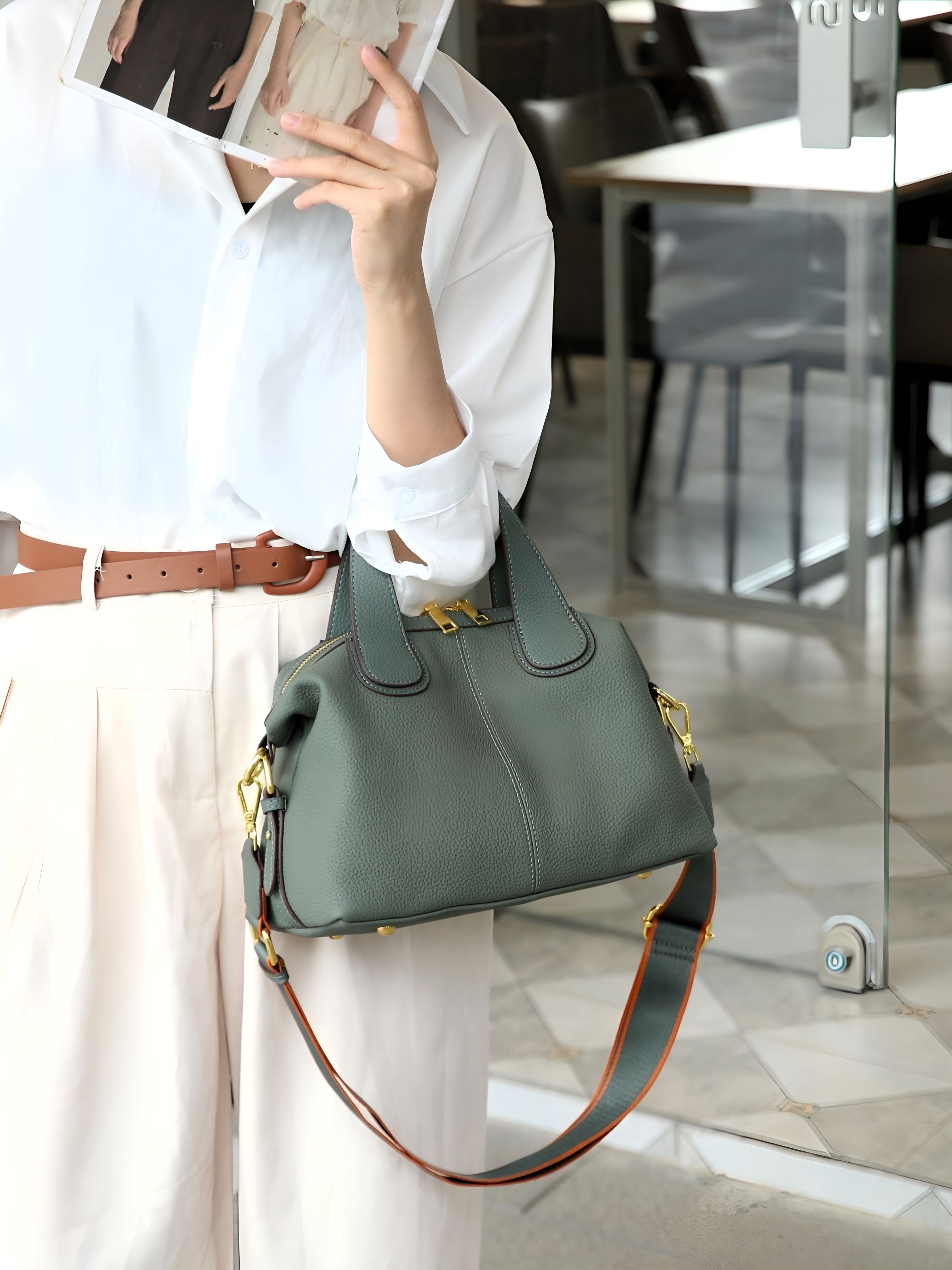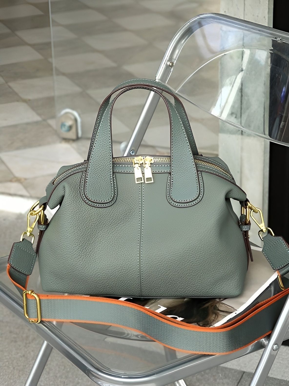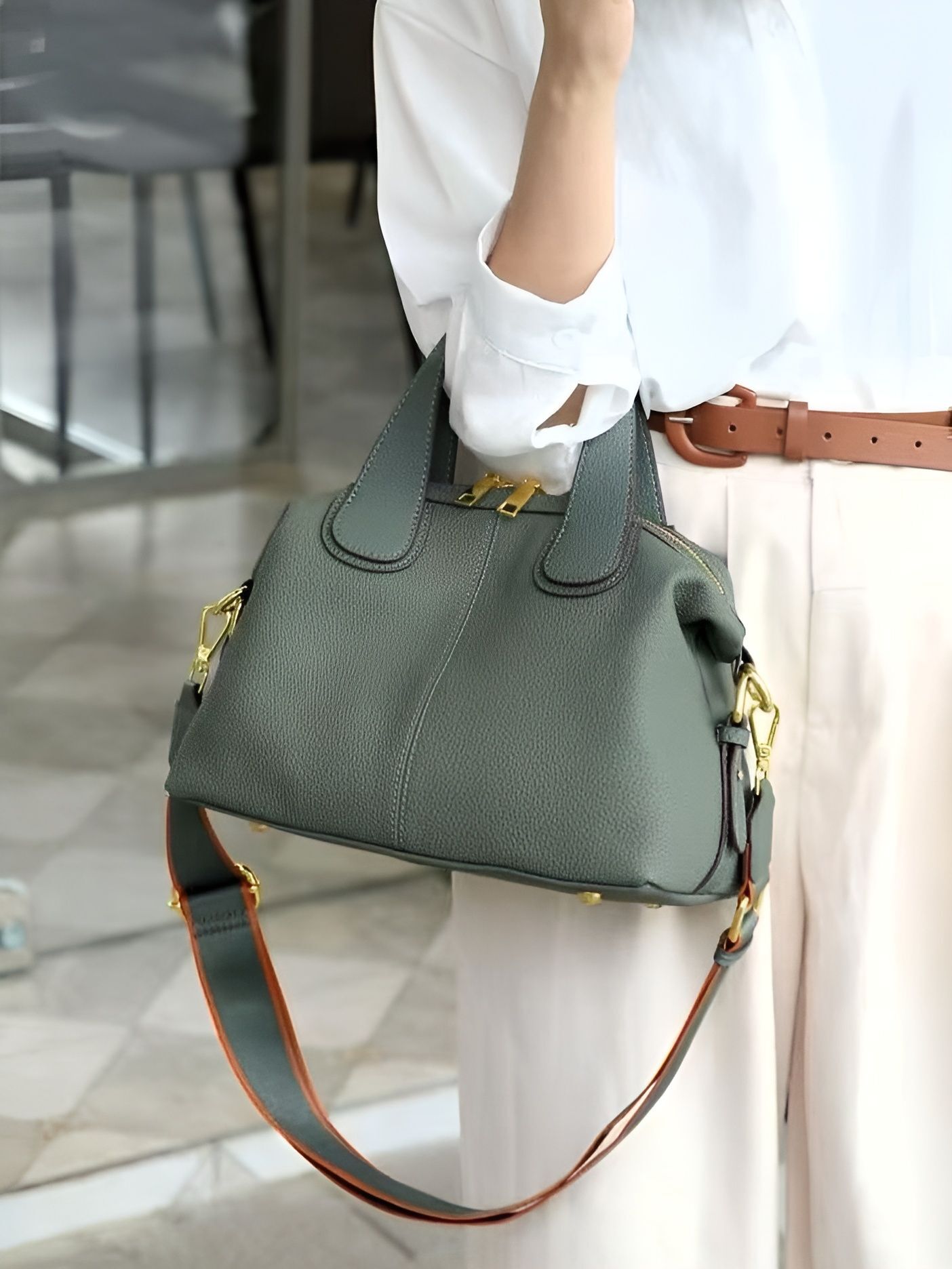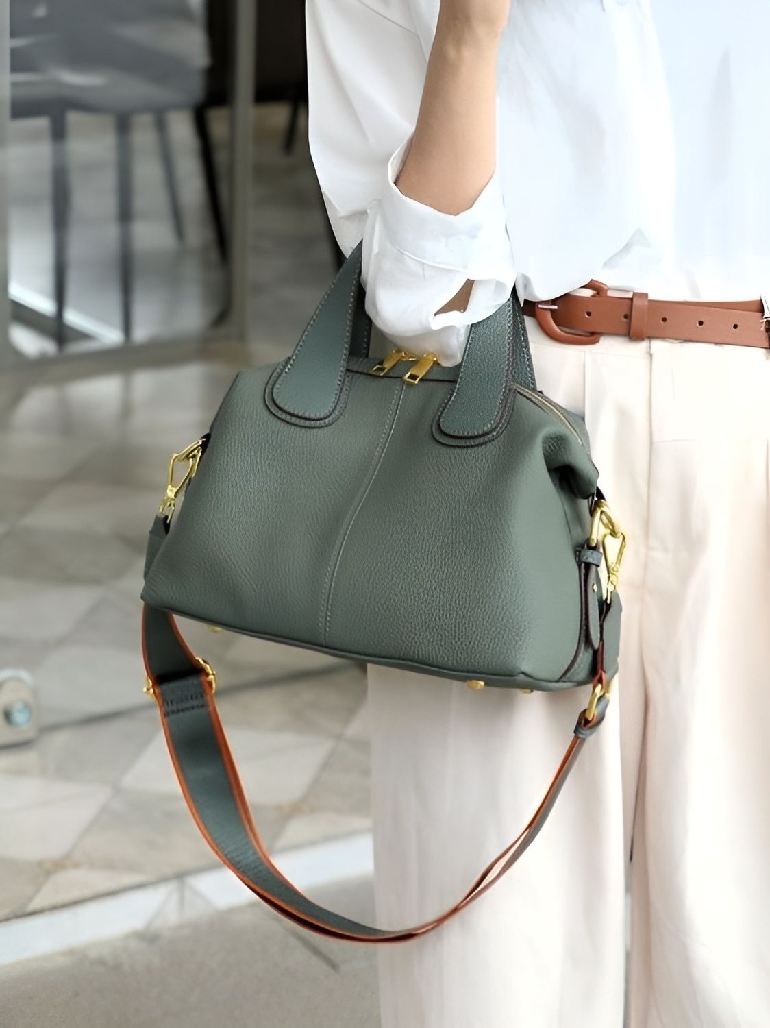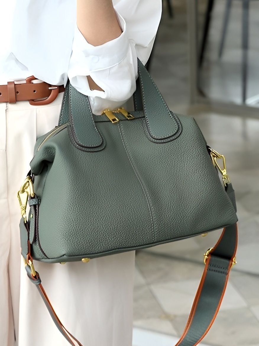 Элегантная повседневная модель выполнена из прочной натуральной кожи с водоотталкивающей пропиткой. Комфортный дизайн обеспечивает три способа носки: через плечо, на запястье или локоть благодаря двум тканевым и одному кожаному регулируемым ремню.